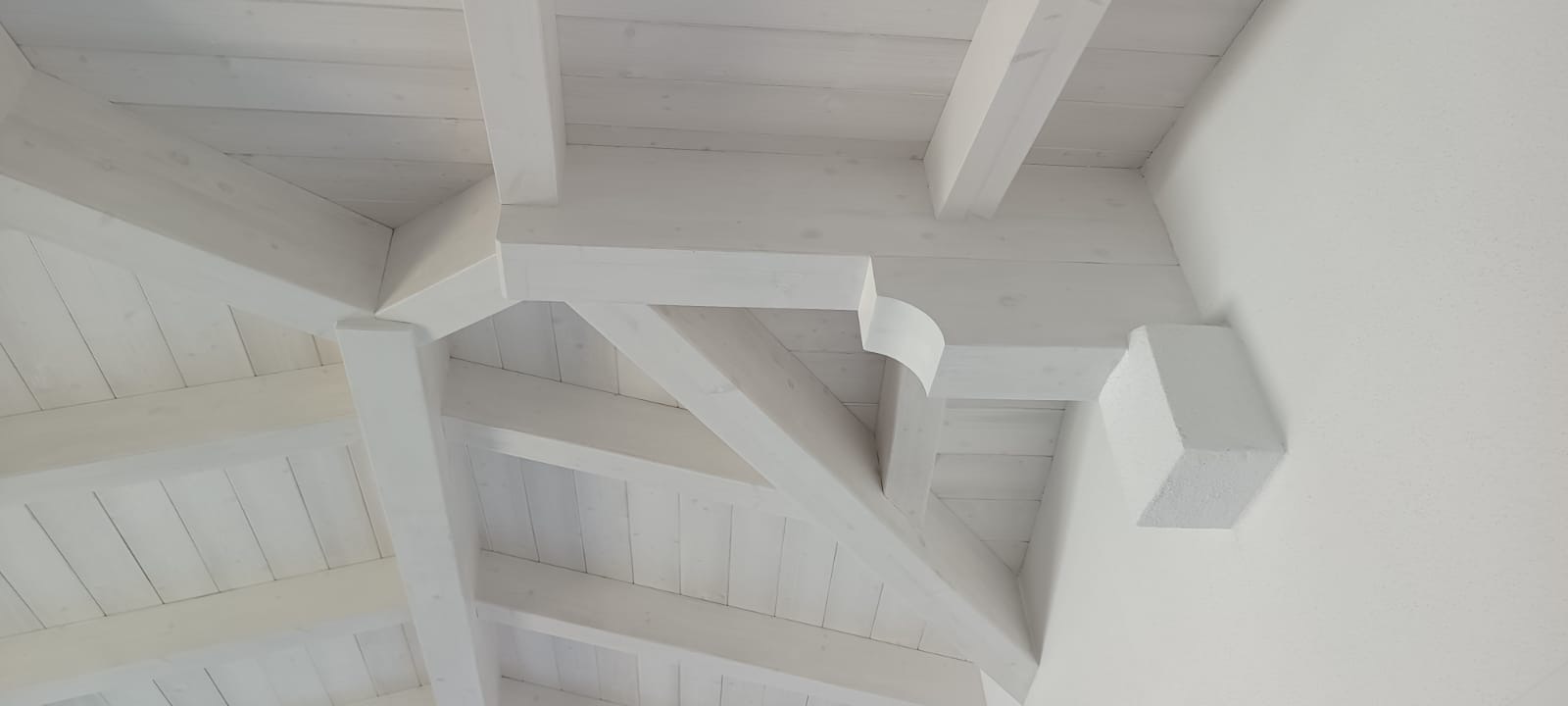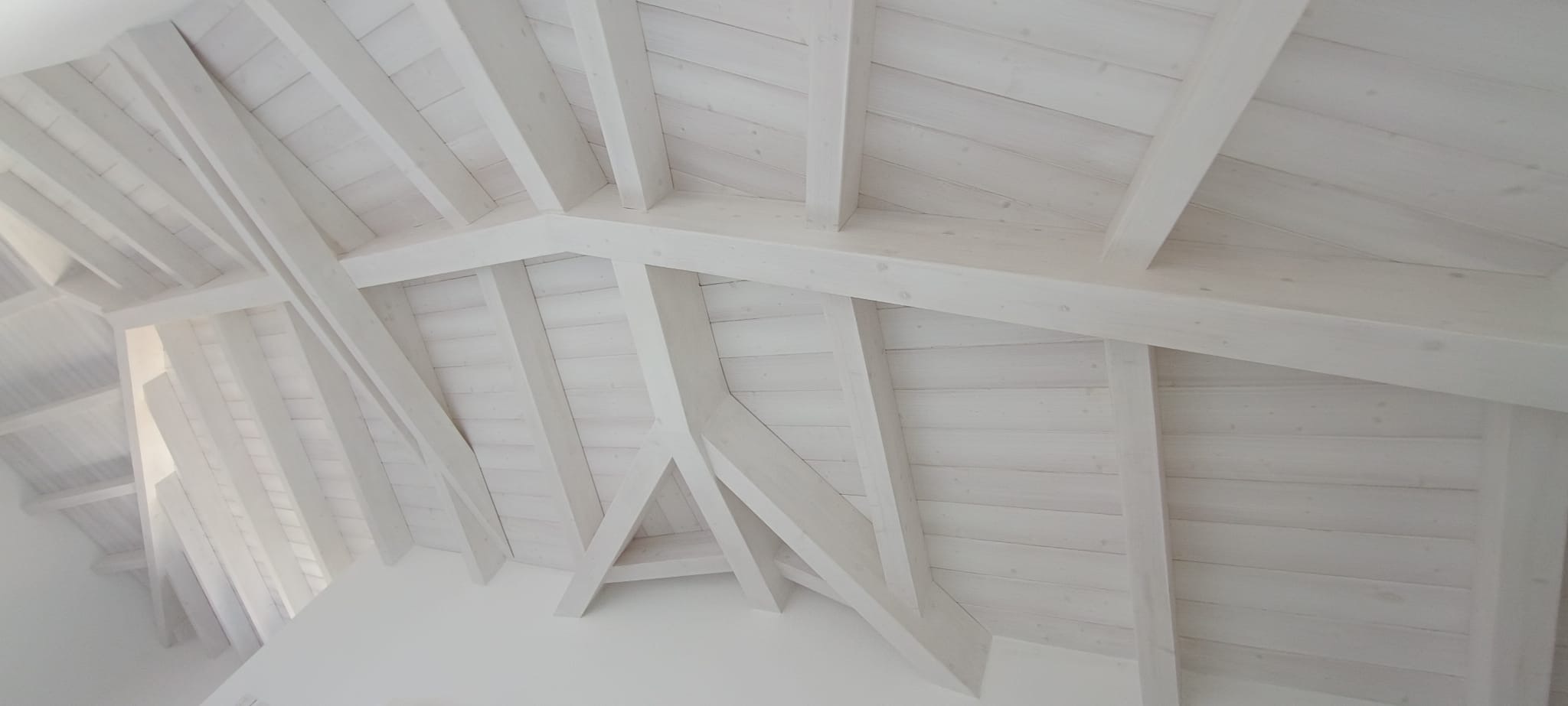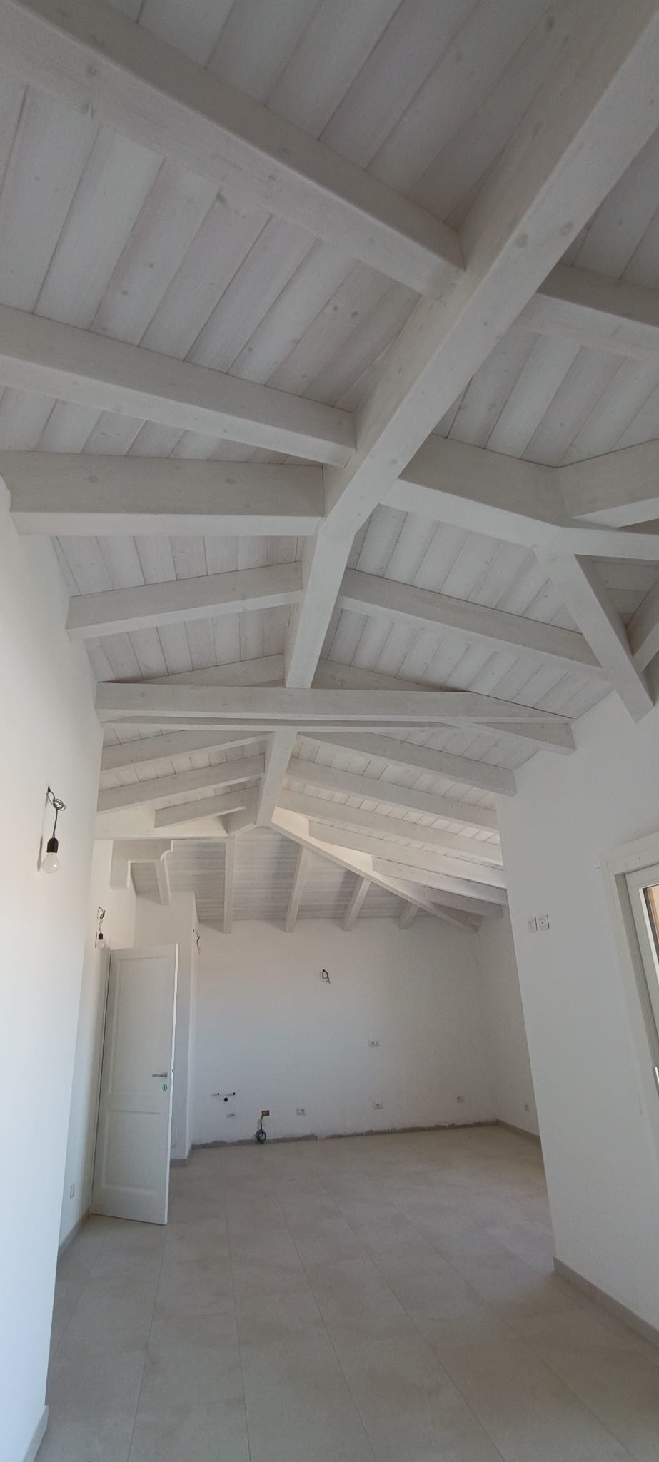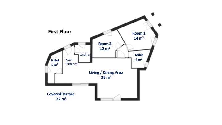 The lower level (above ground), also around 90 square meters, includes four rooms, two bathrooms with windows, and another large covered veranda. The interiors are spacious and bright, with large sea-view windows and white wooden beam ceilings.