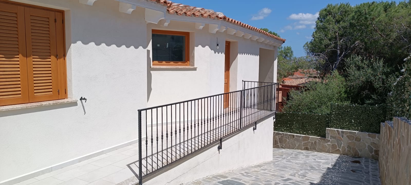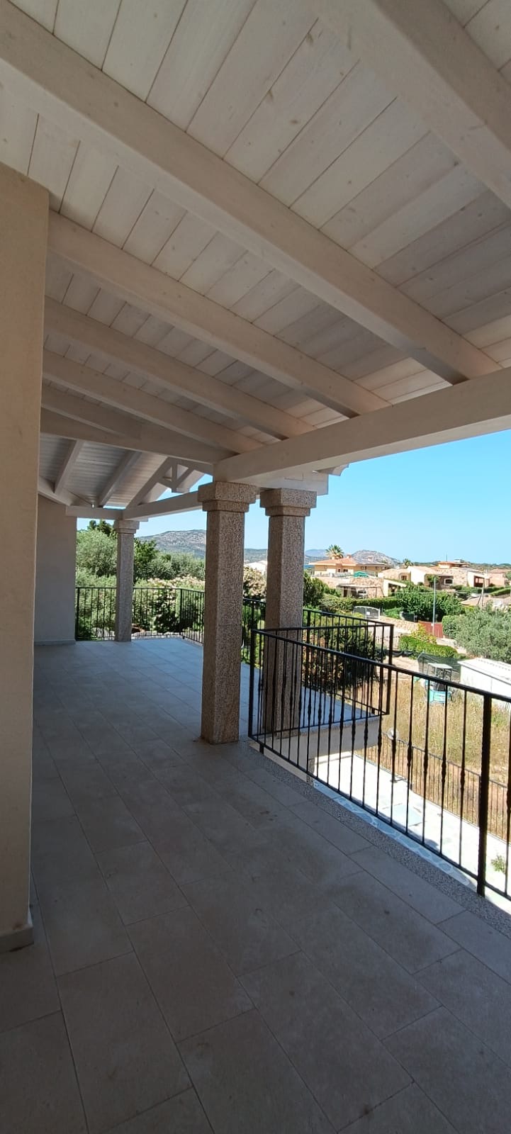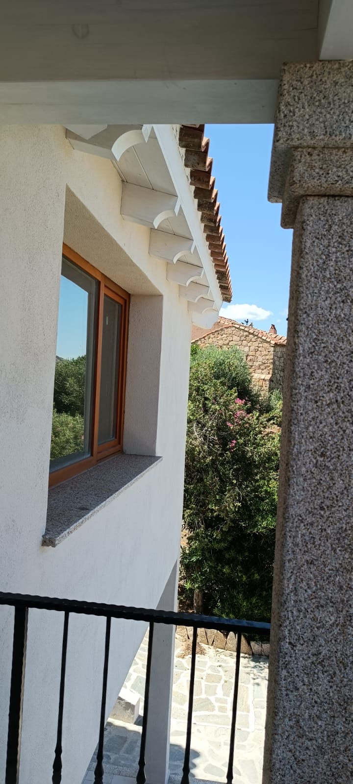 The exterior of this imposing villa features exposed wooden beams, both inside and out, traditional Sardinian stone cladding, granite-capped columns, handcrafted railings, and a private swimming pool.