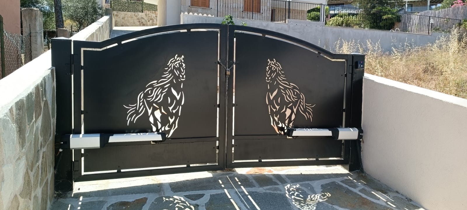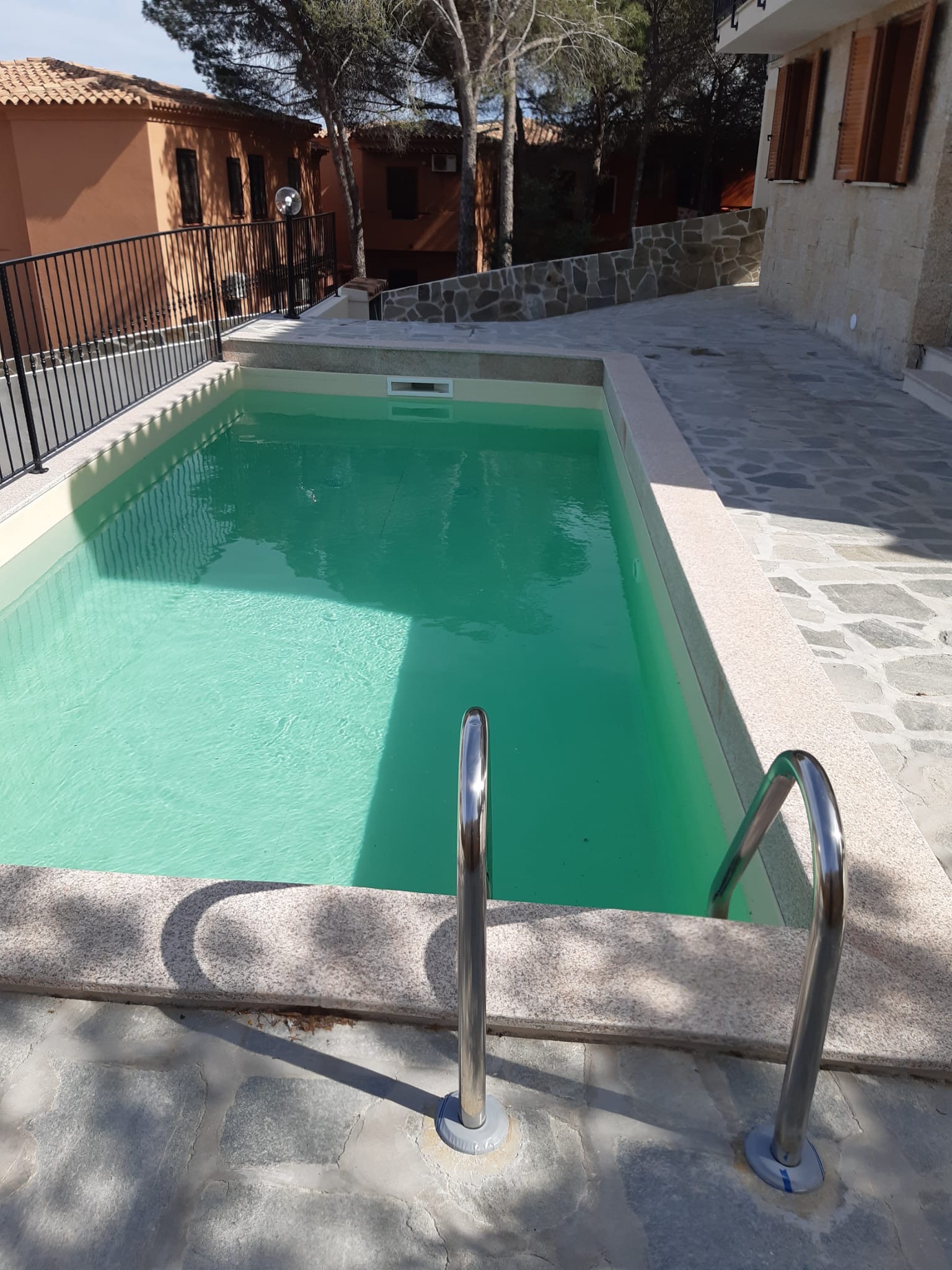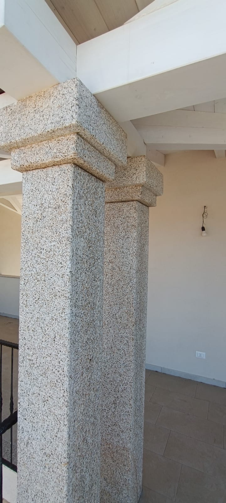 The exterior of this imposing villa features exposed wooden beams, both inside and out, traditional Sardinian stone cladding, granite-capped columns, handcrafted railings, and a private swimming pool.