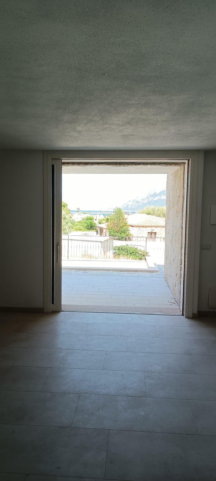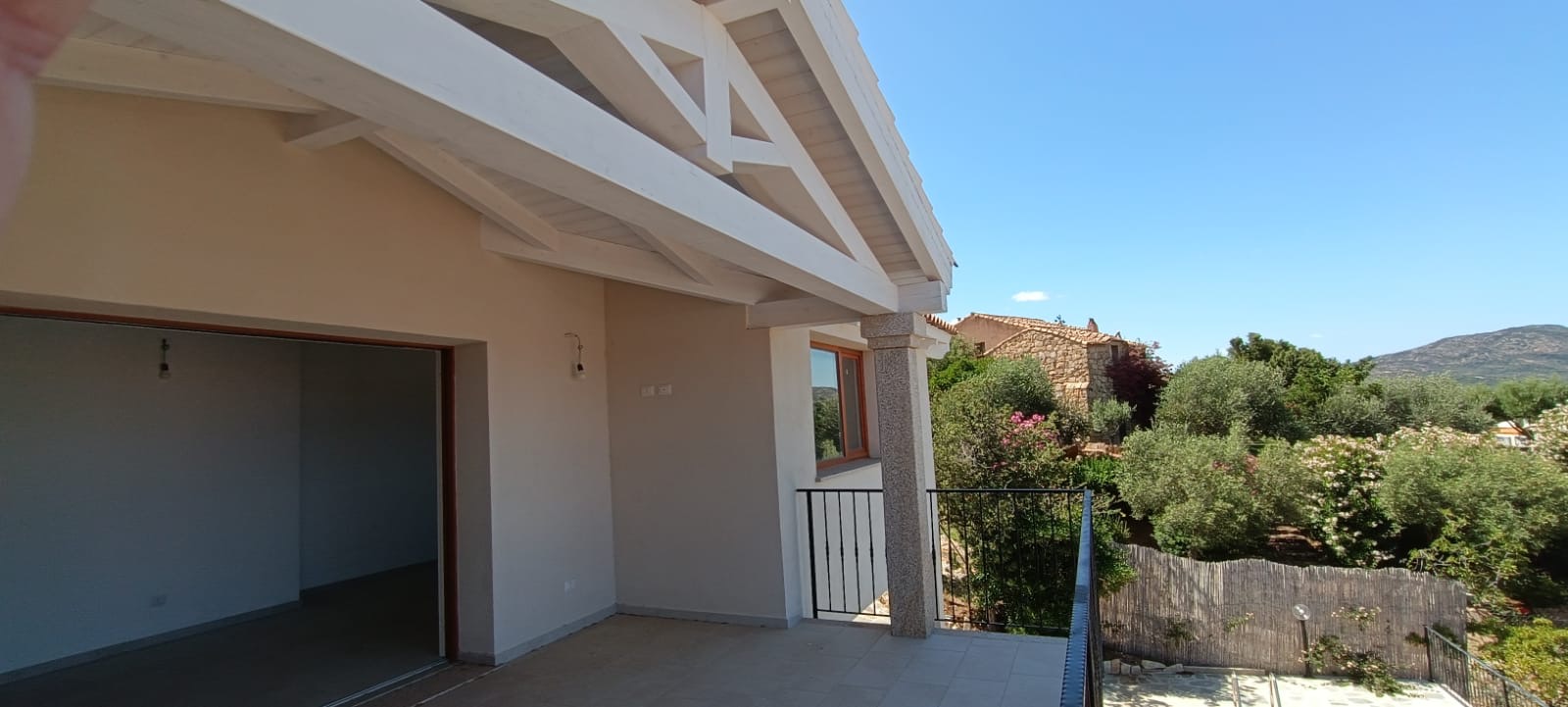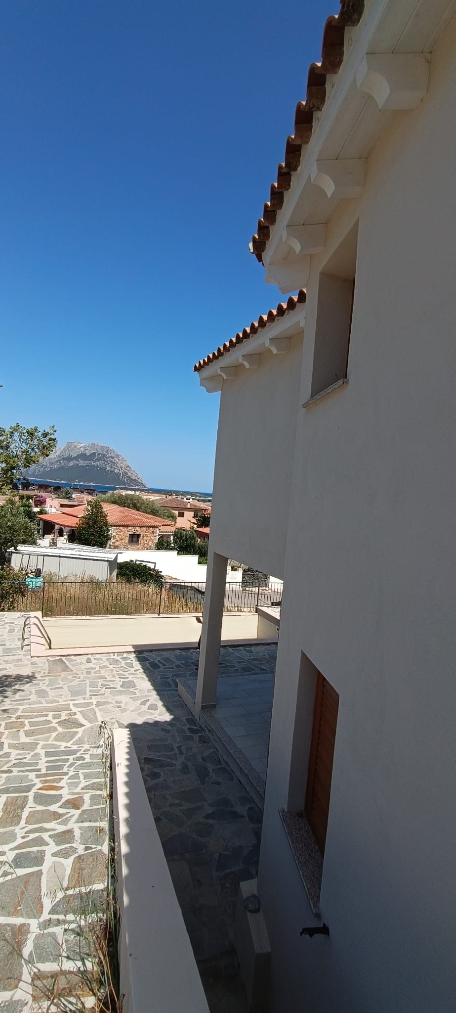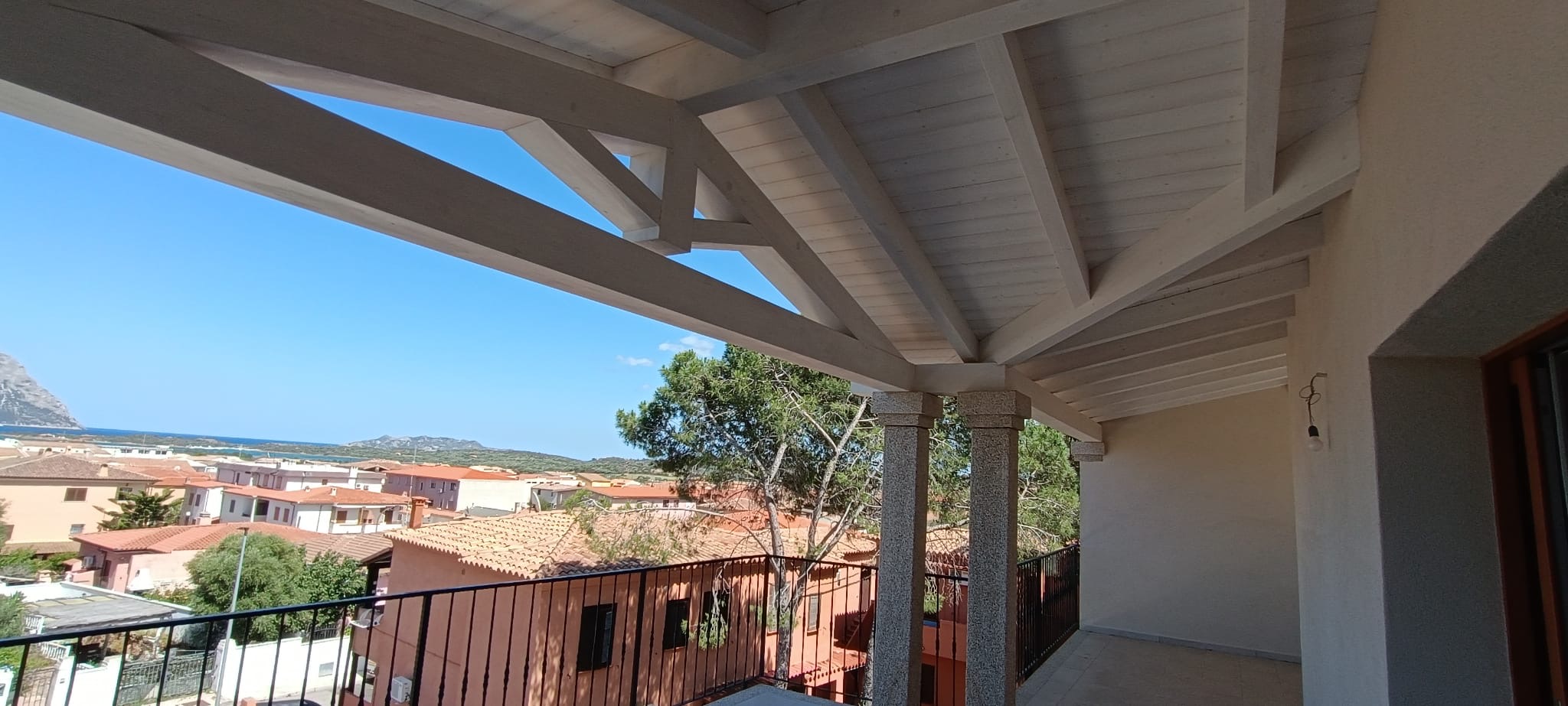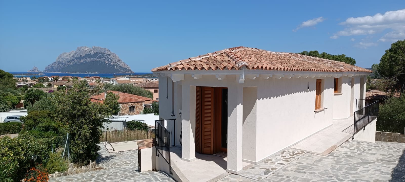 A sliding door opens to a spacious covered veranda, offering a perfect spot to admire the sunrise over Tavolara.